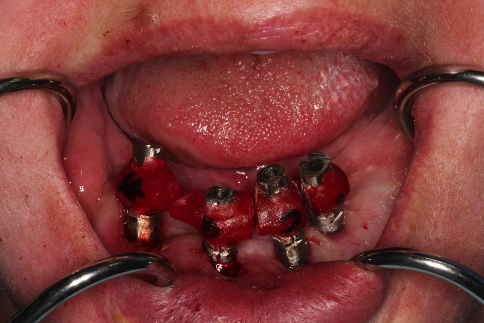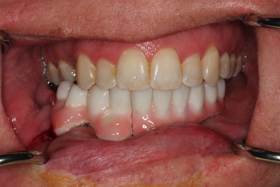 This patient had been shot in the face and lost her bottom jaw. Her jaw was reconstructed from her leg. We placed several implants in her lower jaw and then made and placed two separate implants bridges. She was so grateful as she could smile again!