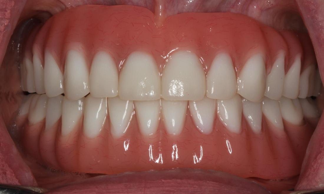 This patient came to us because she was not happy with her dentures and her implant dentures. We made her a prosthesis that she now uses and is very comfortable with. She has told us on several occasions that she feels like she has the same teeth she did when she was in her 20's.