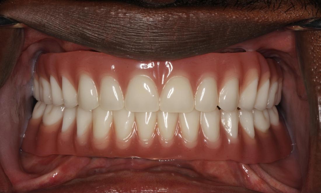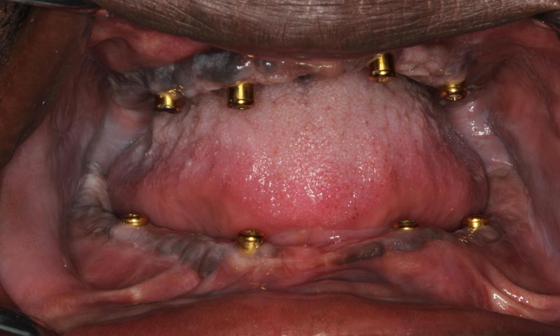 Patient presented post trauma surgery and requested teeth. He did not have enough bone to make him conventional dentures. he opted for implant overdentures and we placed 4 in the top Jaw and 4 in the bottom jaw. We got a great result that he was happy with.