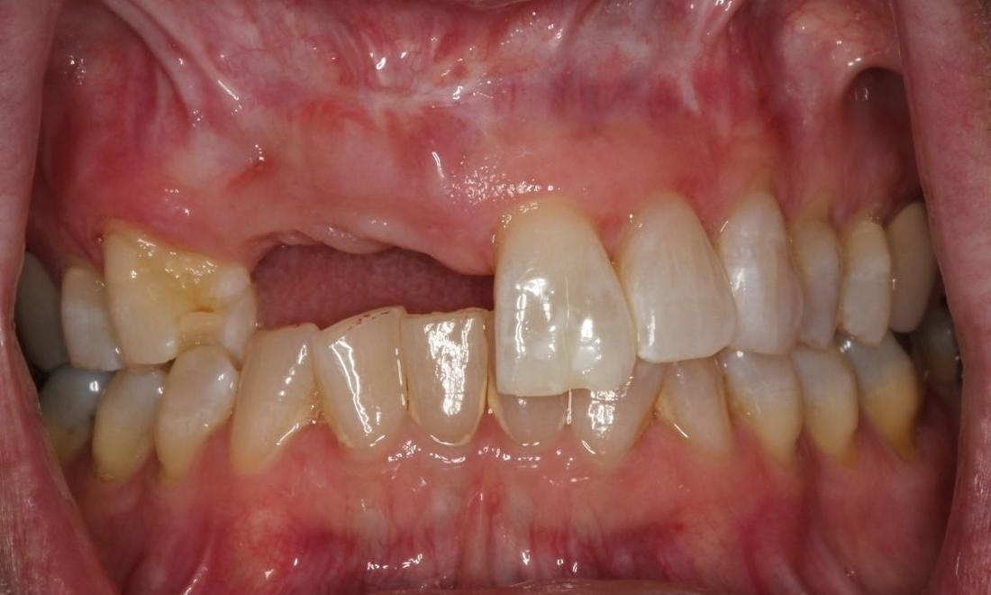 This patient came to us because she had surgery done on her top jaw due a condition called osteomyelitis. Her bone basically dies away and she had to have the dead bone removed. She needed teeth but was unable to have implants or a fixed bridge. We made her a removable partial denture and tired to match the teeth up as closely as we could and provided her with a pretty good result.