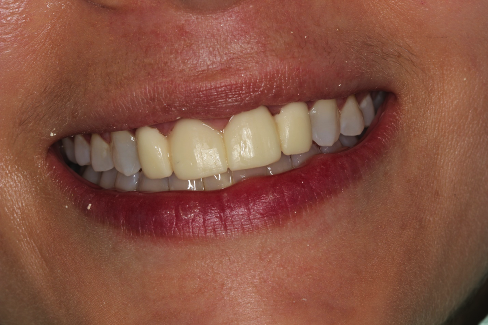This patient came to us because she was not happy with the dental crowns that her previous dentist made her. We made her two dental crowns, two implant crowns, and custom matched and stained her crowns to match her natural teeth. She was delighted with the results and so are we!